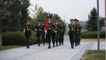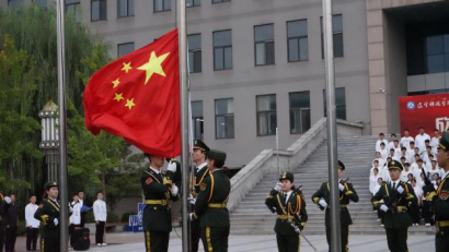 7时整,迎着旭日的光芒,国旗护卫队昂首挺胸,脚踢正步,护送着五星红旗走向升旗台。在庄严而雄壮的国歌声中,神圣的五星红旗冉冉升起。升旗仪式后,全体学生代表向抗日战争中英勇牺牲的先烈默哀致敬。